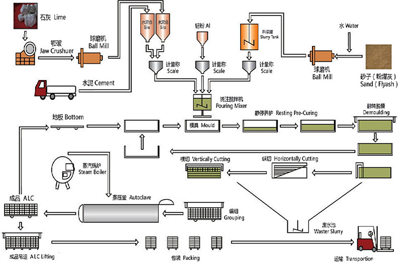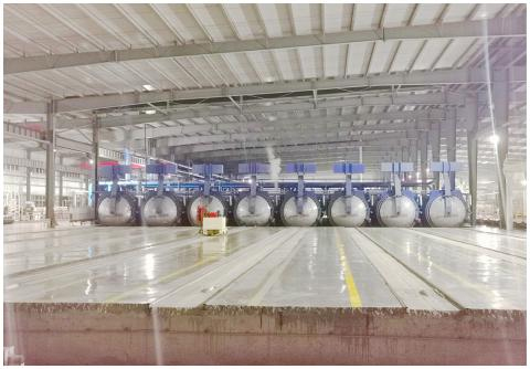 我司生產基地設有一條專業生產 ALC(蒸壓加氣混凝土板)的全自動化生產線,八條高溫蒸壓釜,在將原材料研磨-攪拌-澆注-將鋼筋網籠放到模具里-靜養3小時-脫模切割-升溫、恒溫、降溫共14小時的精細工藝流程后,生產出來的墻板在耐久性、抗凍性、抗滲性方面表現很好。